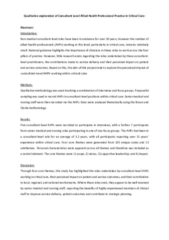 <h4>Introduction</h4>Non-medical consultant level roles have been in existence for over 30 years, however the number of allied health professionals (AHPs) working at this level, particularly in critical care, remains relatively small. National guidance highlights the importance of clinicians in these roles to work across the four pillars of practice. However, little research exists regarding the roles undertaken by these consultant-level practitioners, the contributions made to service delivery and their perceived impact on patient and service outcomes. Based on this, the aim of this project was to explore the perceived impact of consultant-level AHPs working within critical care.<h4>Methods</h4>Qualitative methodology was used involving a combination of interviews and focus groups. Purposeful sampling was used to recruit AHPs in consultant-level positions within critical care. Senior medical and nursing staff were then recruited via the AHPs. Data were analysed thematically using the Braun and Clarke methodology.<h4>Results</h4>Five consultant-level AHPs were recruited to participate in interviews, with a further 7 participants from senior medical and nursing roles participating in one of two focus groups. The AHPs had been in a consultant-level role for an average of 3.2 years, with all participants reporting over 15 years' experience within critical care. Four core themes were generated from 105 unique codes and 13 subthemes. Personal characteristics were apparent across all themes and therefore was included as a central element. The core themes were (1) scope; (2) status; (3) supportive leadership and (4) impact.<h4>Discussion</h4>Through four core themes, this study has highlighted the roles undertaken by consultant-level AHPs working in critical care, their perceived impact on patient and service outcomes, and their contribution to local, regional and national workstreams. Where these roles exist, they appear to be well received by senior medical and nursing staff, reporting the benefits of highly experienced members of clinical staff to improve service delivery, patient outcomes and contribute to strategic planning.